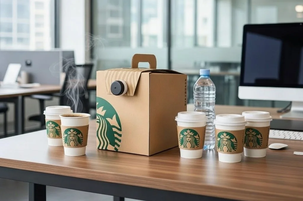 We will provide a convenient carrier filled with 96 fl oz of fresh brewed Starbucks® Coffee (equivalent to 12 8-fl-oz cups). Our cases of water contain 24 bottles.